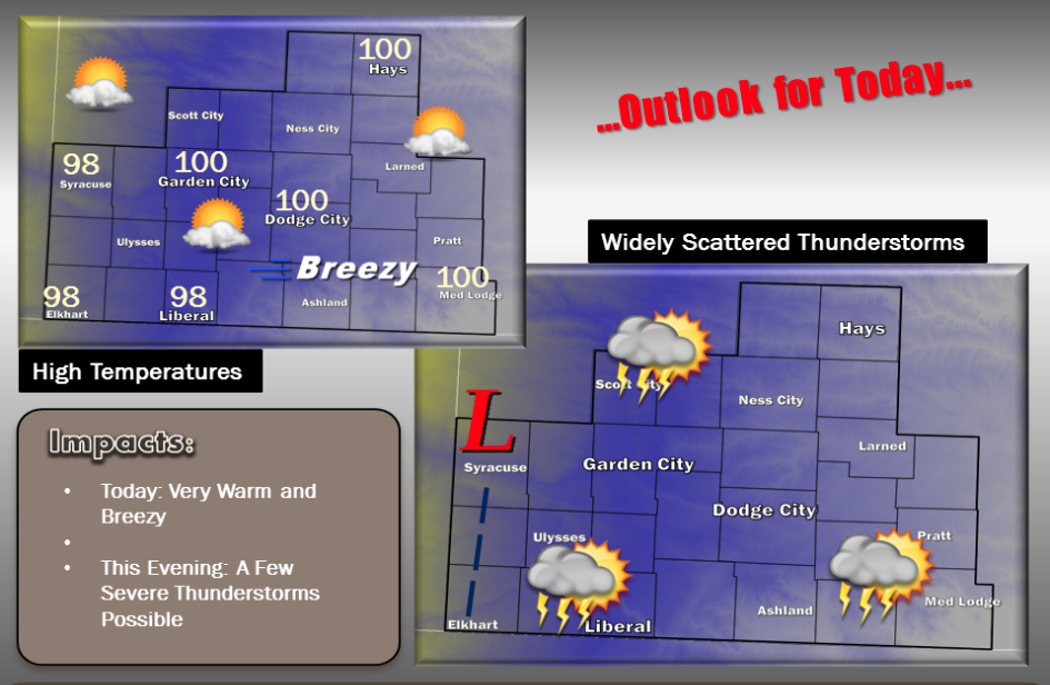 Very warm temperatures are in store this afternoon as highs top out in the upper 90s to around 100 degrees. This will lead to widely scattered thunderstorms late this afternoon into this evening. A few of the storms could produce damaging wind gusts.
