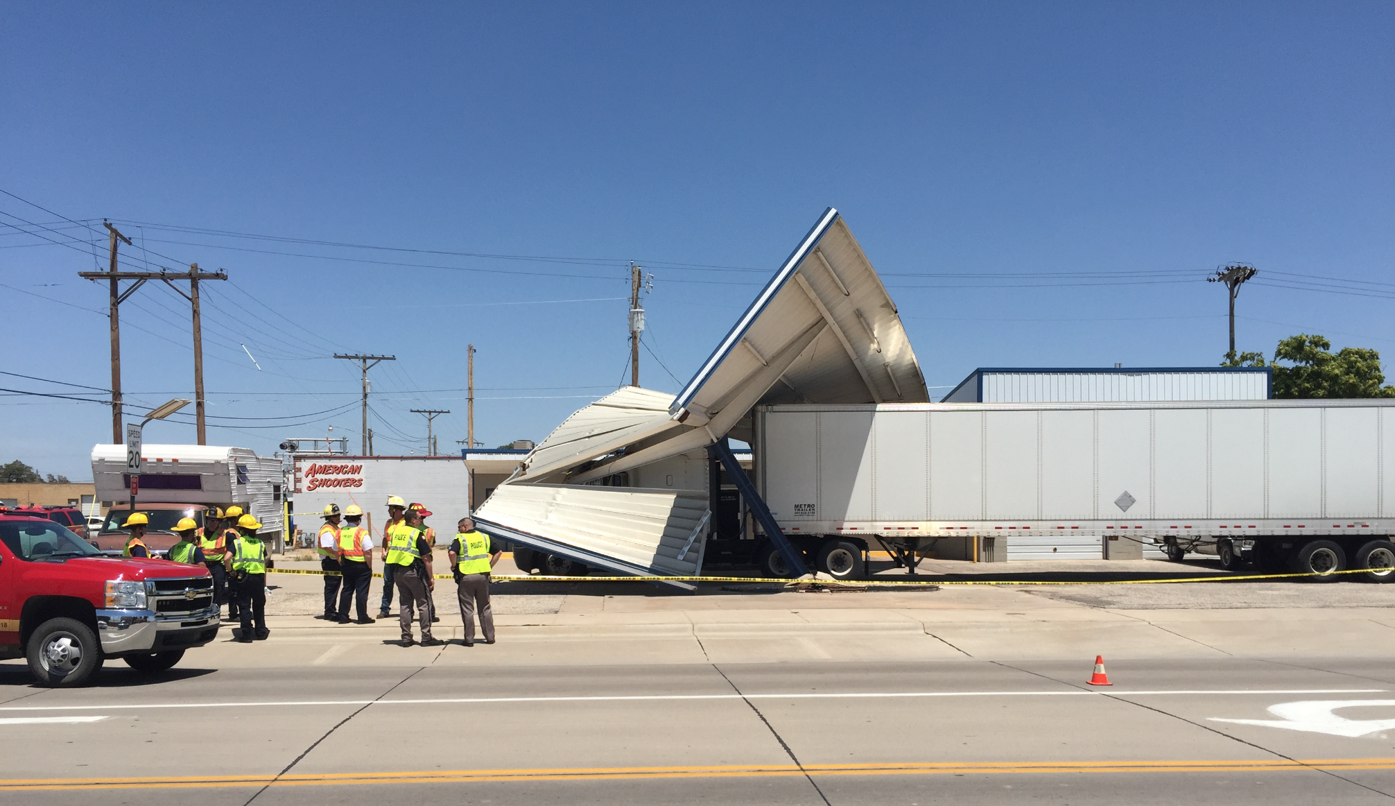 The parking canopy at a former service station at the intersection of Eighth and Allen collapsed on the semi and trailer, which was carrying a shipment of alcohol. It has since been towed out by an Augie’s Towing truck.