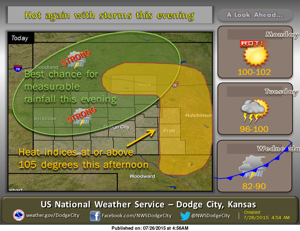Heat indices of at or above 105 degrees will be possible across portions of central Kansas this afternoon with a high temperature of around 100. Scattered thunderstorms are anticipated to develop and move into north and west central Kansas this evening.