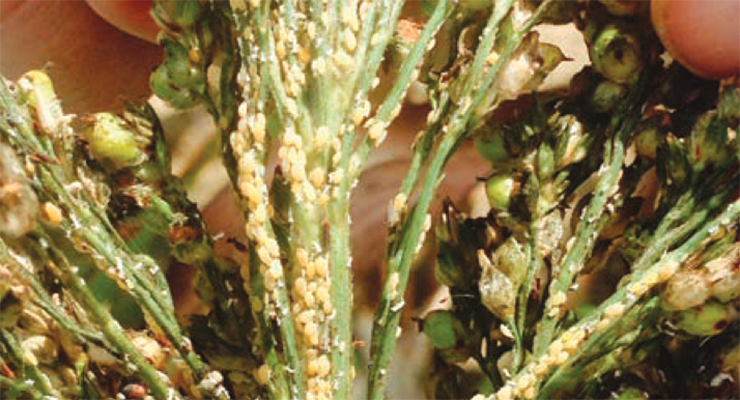 Entomologists and agronomists in southern states have found that a heavy infestation of the sugarcane aphid can kill grain sorghum plants or reduce or prevent head emergence, depending on the timing of the infestation. The aphids can also reduce grain size and grain quality. The bottom line is that this aphid can both reduce yields and lead to late-season lodging by killing plants prematurely. There can also be serious problems harvesting grain when aphids have feeding in the panicle during grain fill.