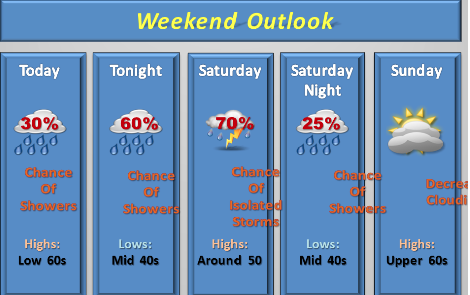 SaturdayShowers and thunderstorms likely before 3pm, then a slight chance of showers. Cloudy, with a high near 58. Southeast wind 8 to 14 mph. Chance of precipitation is 70%. New rainfall amounts between a tenth and quarter of an inch, except higher amounts possible in thunderstorms.