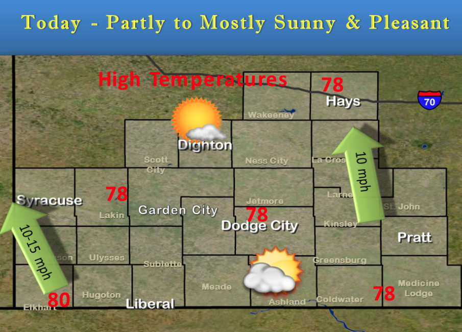 Today will be partly to mostly sunny with highs in the upper 70s to near 80 degrees. Winds will be south to southeast at 10 to 15 mph.