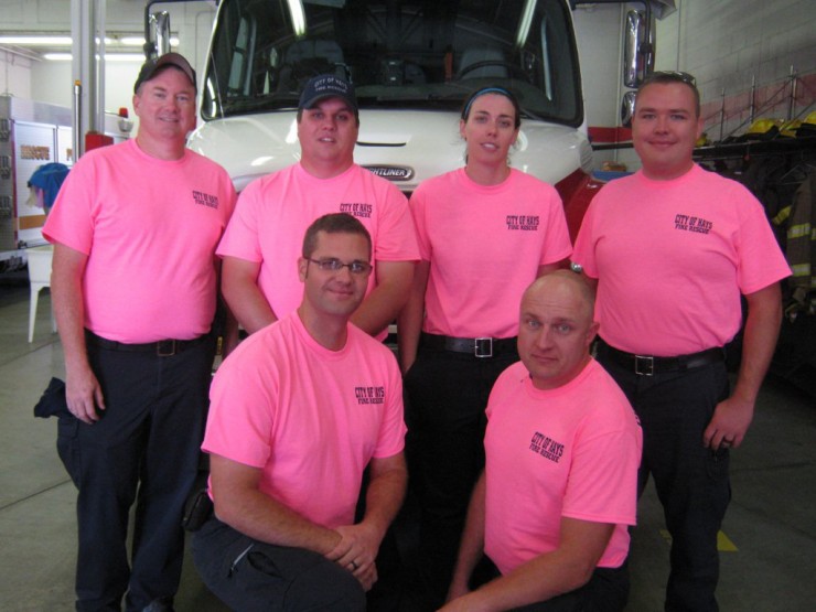Members of the City of Hays Fire Department are joining firefighters across the nation in wearing pink to raise breast cancer awareness. Members of the HFD C-shift pose in their pink t-shirts; L to R Back Row – Captain Aaron Ditter, Firefighter Lucas Everett, Firefighter Allison Friesen, Firefighter Lyle Pantle. Front Row – Lieutenant Luke Scoby, Firefighter Justin Choitz.