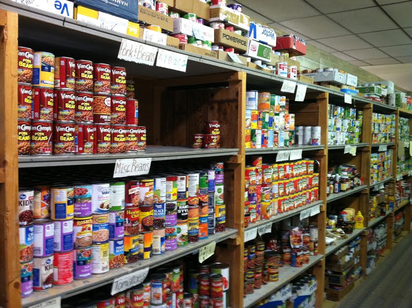 Overflow of food donations are stacked above and below the CAC pantry shelves.