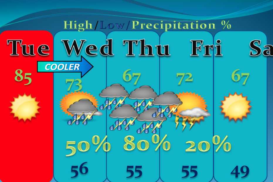 WednesdayA 40 percent chance of showers and thunderstorms. Mostly cloudy, with a high near 70. North northwest wind 6 to 16 mph becoming northeast in the afternoon.