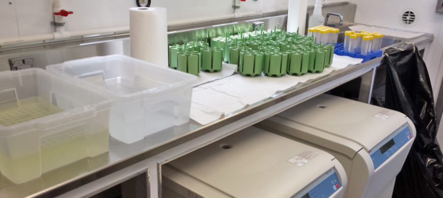 In July 2015, KDWPT partnered with the U.S. Fish and Wildlife Service (USFWS) to sample 11 locations from six river basins throughout Kansas to detect the presence of environmental DNA (eDNA) left behind by bighead and silver carp (collectively known as Asian carp). Over a three-day span, two field crews, each comprised of two KDWPT Aquatic Nuisance Species (ANS) program staff and one USFWS staff, collected 204 eDNA samples. An additional USFWS crew, manning a portable trailer with cooled centrifuges, prepared the samples for shipment to and processing by the USFWS Whitney Genetics Lab in LaCrosse, Wis.