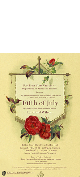 Just six weeks after its sell-out musical “Footloose,” Fort Hays State University’s music and theatre department will premiere its second theatre production, “Fifth of July.” Performances take place Thursday, Friday and Saturday, Nov. 12, Nov. 13 and Nov. 14 at 7:30 p.m., and Nov. 15 at 2:30 p.m. in Felten-Start Theatre in Malloy Hall.