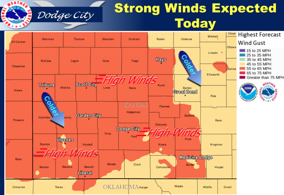 Strong northwesterly winds with gusts in excess of 50 mph will develop behind a cold front moving across western Kansas through mid afternoon.