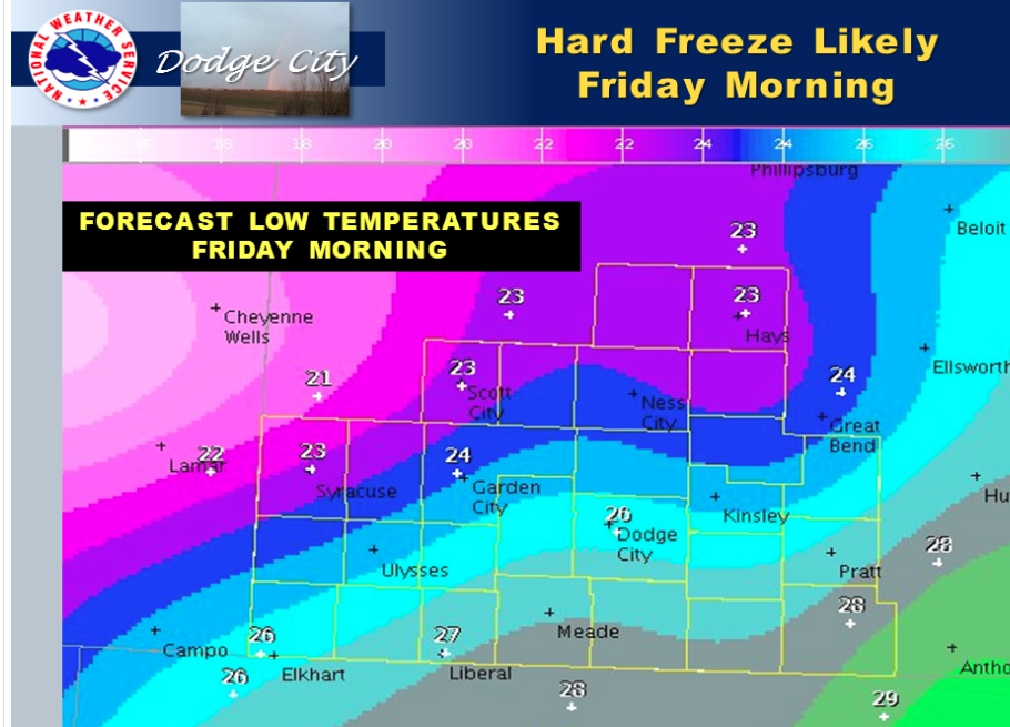 Highs will be in the 50s today with clear skies and northwest winds 10 to 15 mph. Radiational cooling tonight will allow temperatures to fall into the low to mid 20s across much of southwest Kansas. This will be the first hard freeze this fall for many locations.