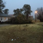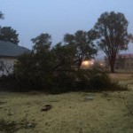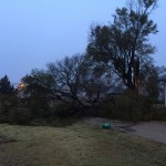One tree fell across U.S. 183, completely blocking traffic. Working by illumination from vehicle headlights, two residents chopped the large tree into small enough pieces to move them off the road, reopening the highway.
