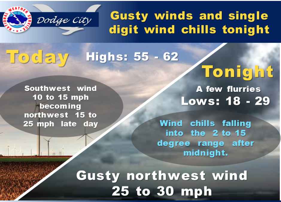 Gusty northwest winds expected behind a cold front which will cross southwest Kansas during the afternoon. As cold air invades western Kansas overnight gusty northwest winds will be at 25 to 30 mph. This will result in wind chills falling back into the 2 to 15 degree range after midnight.