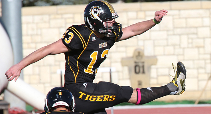Brown tested O’Brien right out of the gate. On the road for the season opener at Emporia State University, O’Brien’s first collegiate field goal try — and make — was a 47-yarder. Later that season, he hit a career-long 48-yarder. Then on a wet, muddy field at Southwest Baptist (Mo.) University in Bolivar, Mo., he split the uprights from 36 yards out to make it a one-score game in the fourth quarter of a contest the Tigers eventually won in overtime.