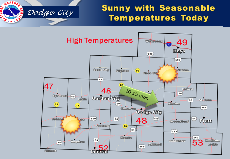 Skies will be sunny today with northwest winds at 10 to 15 mph. Seasonable temperatures can be expected with highs in the upper 40s to lower 50s.