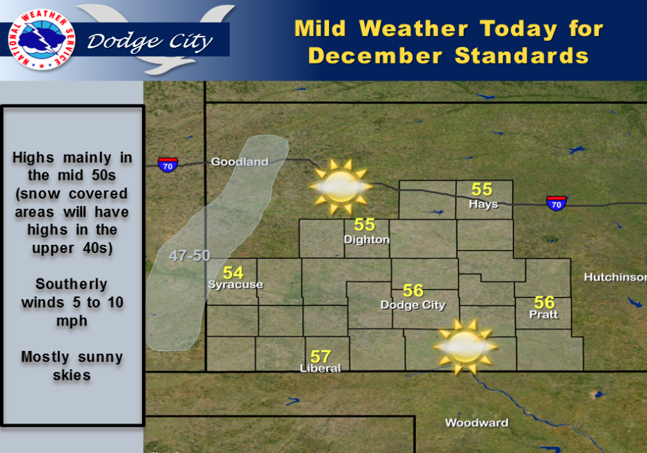 A pleasant day is in store for southwestern Kansas. High temperatures will top out in the mid 50s in most locations. Snow cover out near the Colorado border will keep highs in the upper 40s to near 50. These areas will see a lot of melting today. The above normal high temperatures will continue through the end of the week.