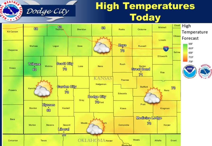 Partly sunny today with highs in the upper 60s to the lower 70s this afternoon.