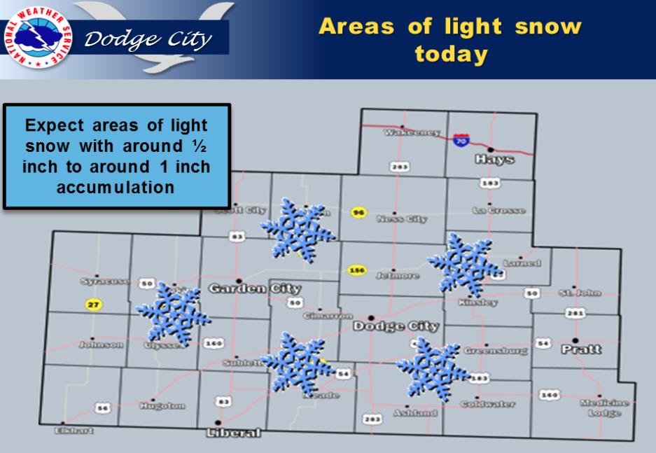 An upper level disturbance will move across western Kansas today bringing areas of light snow to much of southwestern Kansas. Snowfall amounts will range from around a one half to an inch across the area before ending later this afternoon and early evening.