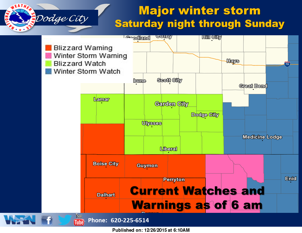 A major winter storm will impact southwest and south central Kansas late this weekend. Blizzard and Winter Storm Watches and Warnings have been issued given the expected snowfall along with the strong gusty winds. If traveling late this weekend be prepared by planning ahead. Have a winter safety kit and check on the latest road conditions. Stay up to date on this weekend weather event at Eagle Radio and Hayspost.