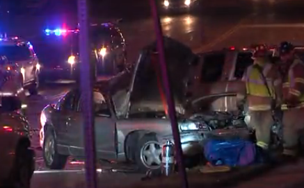 The accident occurred Sunday evening in Overland Park when a car ran a red light and hit a truck carrying two people. Those two vehicles went into another lane and hit a minivan carrying five people.