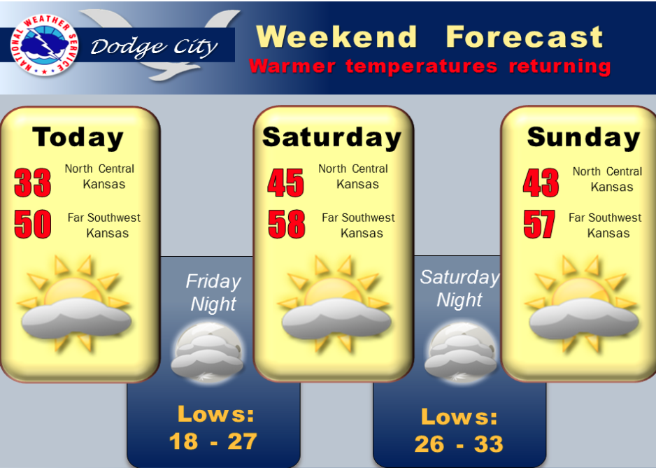 A warm front will gradually move across southwestern Kansas into the Weekend with warmer temperatures.