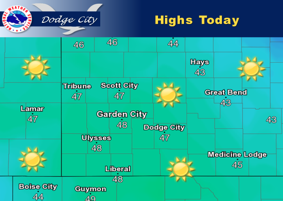 Highs today look to top out in the mid to upper 40s with mostly sunny skies.