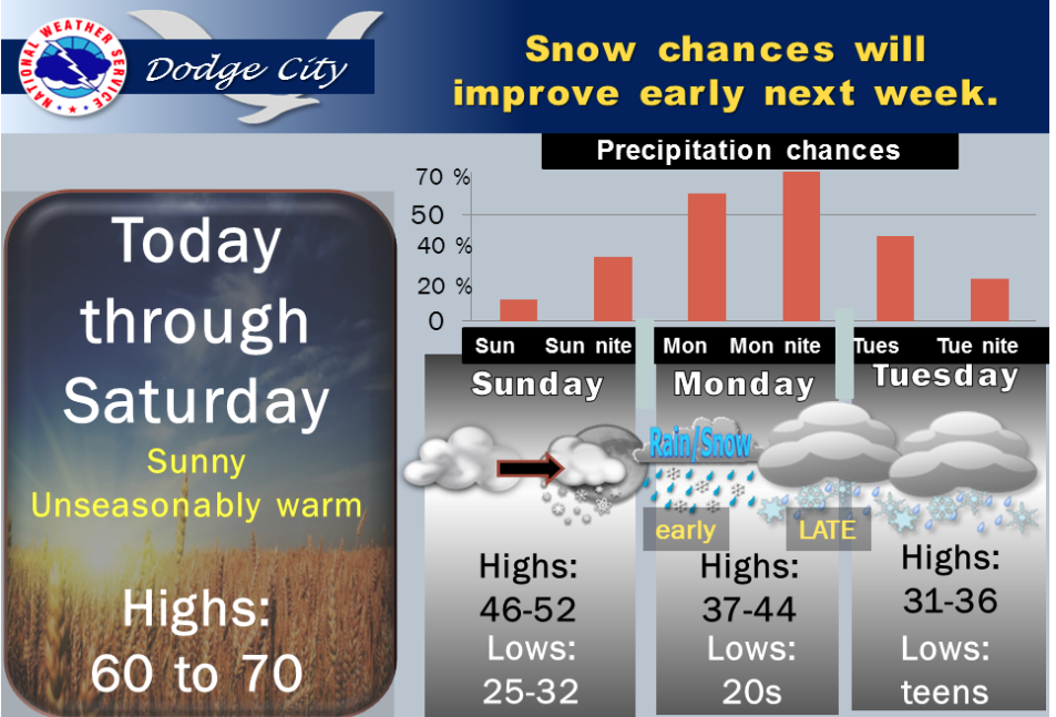 A cold front Saturday night will bring the next shot of colder air to western Kansas. There will also be a chance for snow from Sunday night through late Tuesday. At this time it appears that the best chance for measurable snowfall will be Monday and Monday night with significant snow accumulations possible across portions of western Kansas. Given the uncertainty of the track of this next winter storm system it is still too early to tell how much snow will fall in western Kansas.