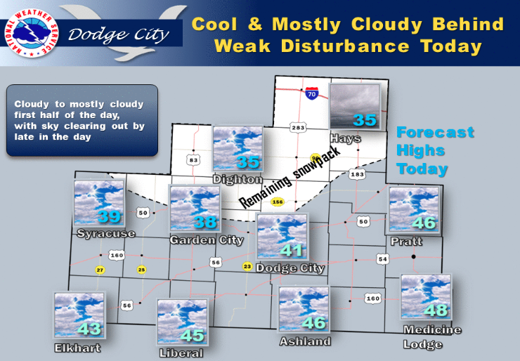 Weak upper disturbance this morning will not produce any measurable precip. Highs today mid 30s to upper 40s