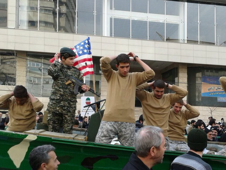 Scene of capturing #US sailors recreated in the rally for anniversary of #Iran‘s revolution in #Tehran. pic.twitter.com/nomRF5PNEl