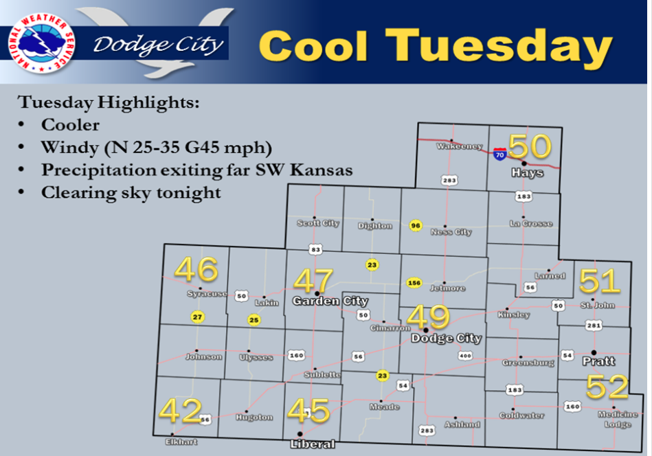 We will see a cooler and windy Tuesday with precipitation tapering through the day.