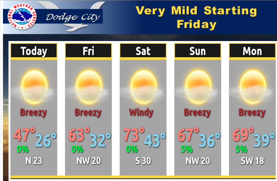 Highs will rise well above average starting Friday and into Monday. The average highs for this time of year are around 50. Elevated to critical fire weather conditions are possible on Saturday afternoon with lots of wind and low relative humidities. A storm system may effect much of the Central Plains on Tuesday with thunderstorms and snow possible.