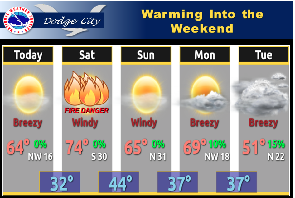 Highs will warm well above average Today and into the Weekend. Our average highs are around 50 for this time of year. Winds will pick up on Saturday, with low relative humidities, pushing the fire danger to elevated. A cold front could bring some light showers or sprinkles on Tuesday.