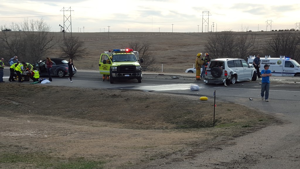 Emergency responders from Ellis County and Hays were on scene a few miles north of Hays on Hwy 183 around 5 p.m. Saturday after a multiple vehicle accident blocked traffic and sent at least one person to the hospital.