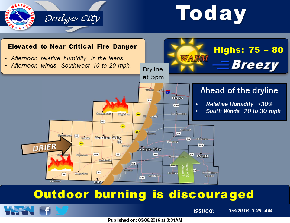 FileLToday will be windy and warm, with high temperatures between 75 and 80. A dryline will move across western Kansas today. West of this dryline, elevated to near critical fire danger levels are expected Outdoor burning is discouraged this afternoon.