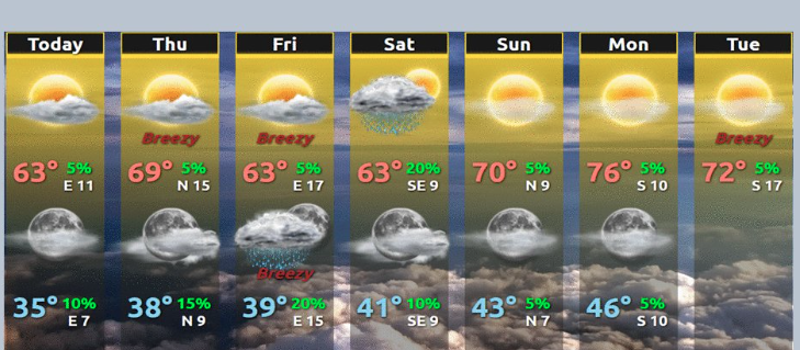 FridaySunny, with a high near 67. Light and variable wind becoming south southeast 8 to 13 mph in the morning.