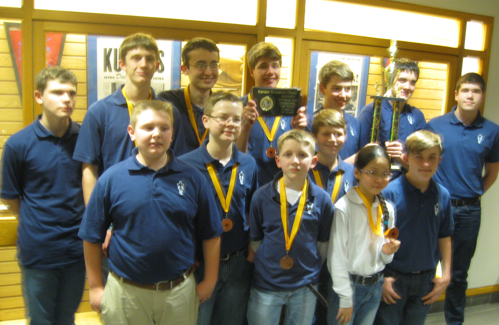 The Monarch junior high, competing against 27 other middle schools of all sizes, finished in a tie for third with 16 points behind Lawrence West Middle School (17.5 points), and Concordia Junior High (16.5 points). St. Mary’s Academy of St. Mary’s, Kansas also finished with 16 points, and was awarded the third place trophy on the basis of the tiebreak system.