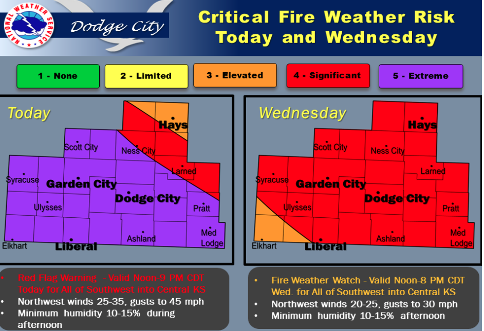 Today and Wednesday will see significant, extreme risk for critical fire weather conditions in western and central Kansas.