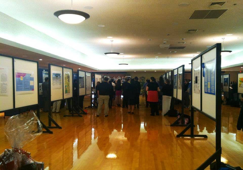 Posters include scholarly and creative work from the College of Arts, Humanities and Social Sciences, the College of Business and Entrepreneurship, the College of Education, the College of Health and Behavioral Sciences, and the College of Science, Technology and Mathematics.