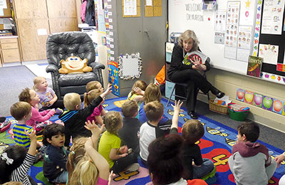 Martin chatted with the students as she sat on the floor among them, then deferred to a chair to read “The Grouchy Ladybug” to the preschoolers.
