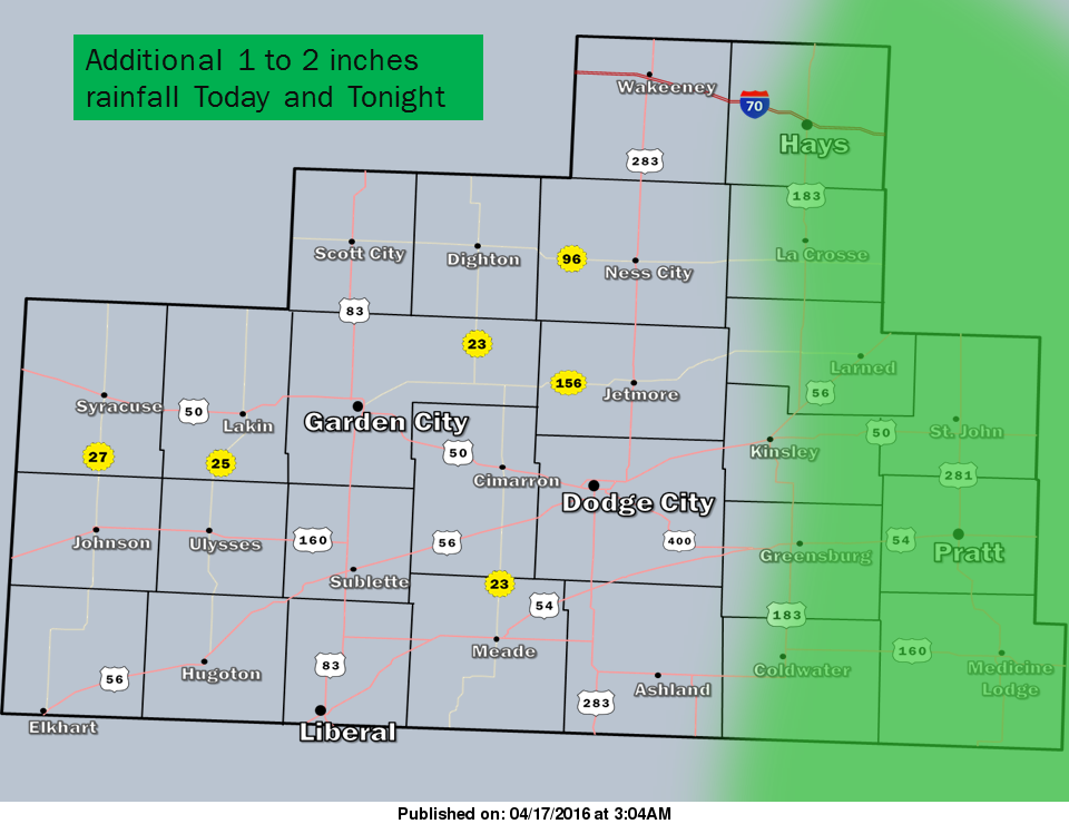 FileLRain and isolated thunderstorms will likely be ongoing to start Sunday morning as well as later in the day. Even if the rainfall stops as the morning progresses, additional rounds of moderate rainfall will resume by mid afternoon. Be alert to rising water in flooded ditches, creeks and low lying areas along rural roads through tonight. A Flood Watch remains in effect until Monday morning (Hays-LaCrosse-Larned-Kinsley-Coldwater-St. John-Pratt-Medicine Lodge).