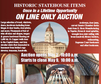 The state is planning to auction off thousands of items salvaged from the renovated Kansas Statehouse in Topeka. The online auction is scheduled May 2-9. See the complete list of items here.