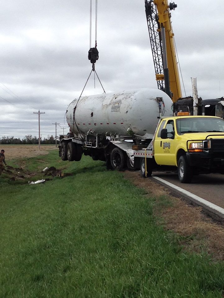 UPDATE at 1:55 p.m.–The truck and propane tank are being removed. The highway is expected to open soon, according to the Kansas Highway Patrol.