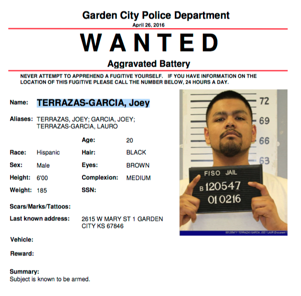 Joey Terrazas-Garcia, 20, Garden City, is wanted for aggravated battery in connection with the shooting.