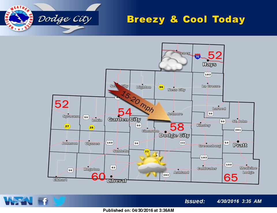 Today will be breezy and mostly cloudy with highs in the 50s. More sunshine is expected along the Oklahoma state line, but skies are expected to remain mostly cloudy along interstate 70. Although temperatures will still be cool relative to climatology, it will be warmer than it was on Friday.