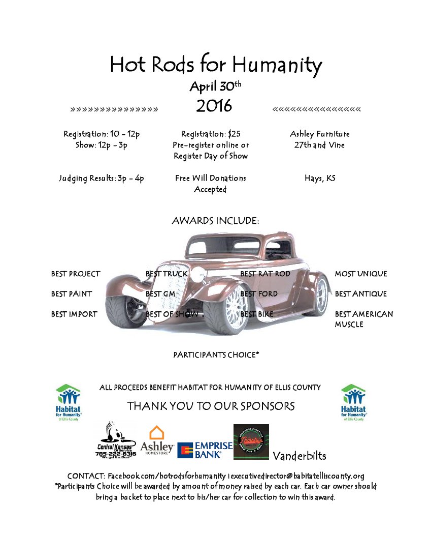 Hot Rods for Humanity is scheduled for April 30 at the Ashley Furniture parking lot, at 27th and Vine streets. Registration is from 10 a.m. to noon, with the show from noon to 3 p.m.