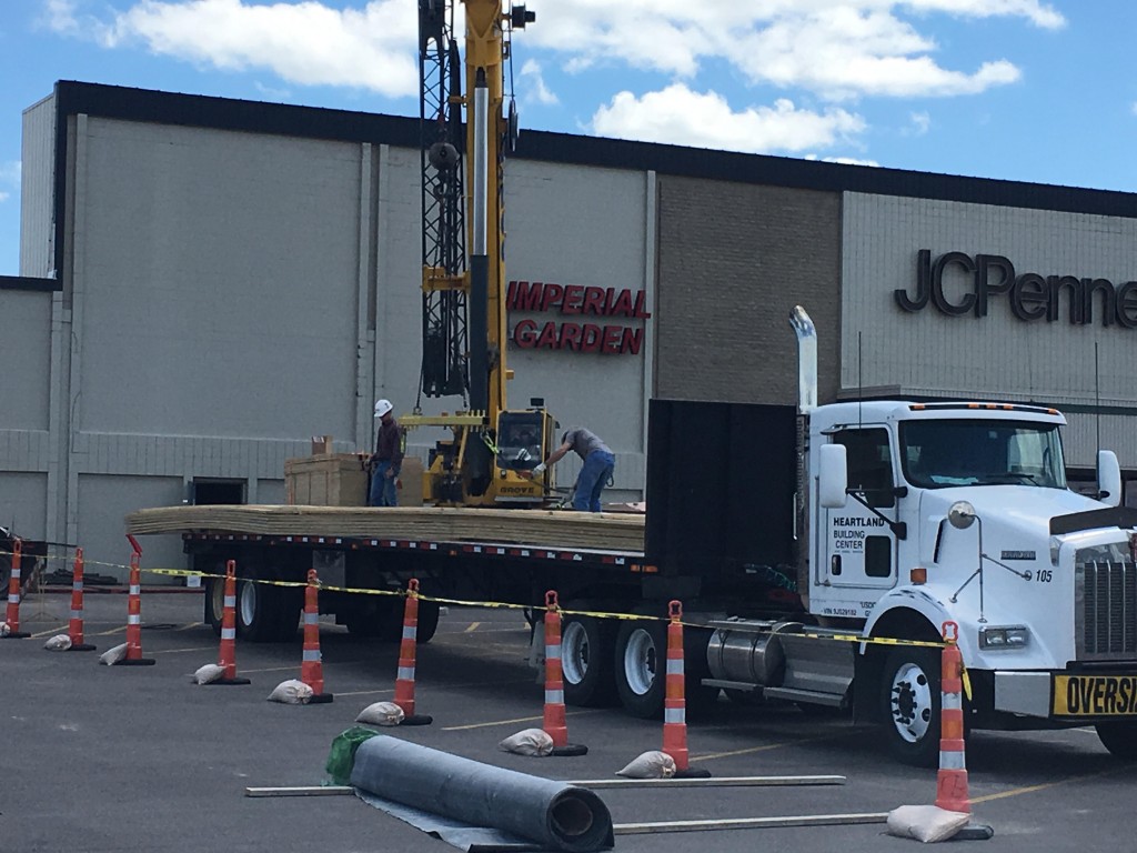 As the shopping center prepares for the weekend events, work continues on the roofing section that collapsed and within affected stores.