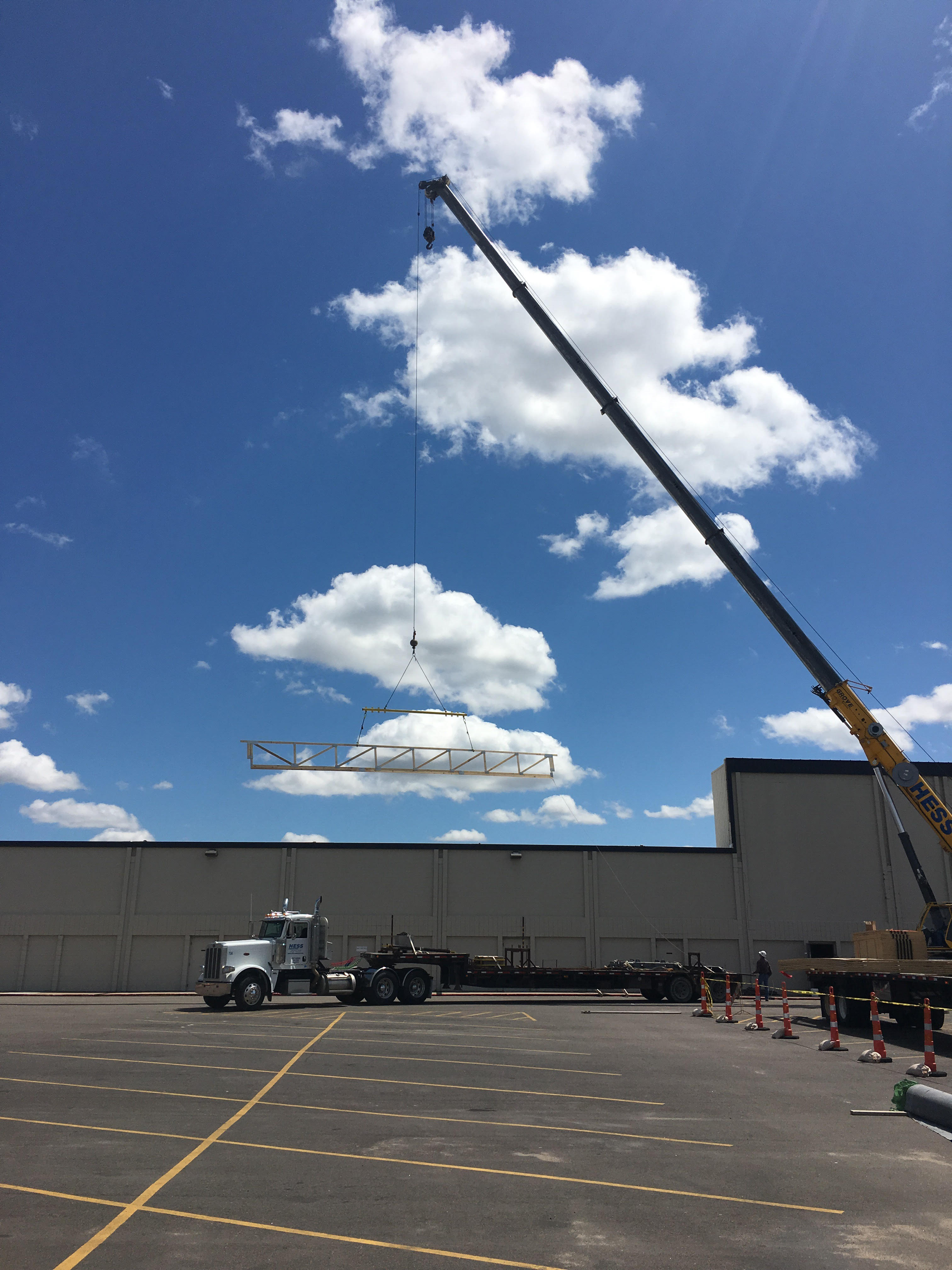 Roof work began Tuesday with trusses being put in place to repair the damaged roof section.
