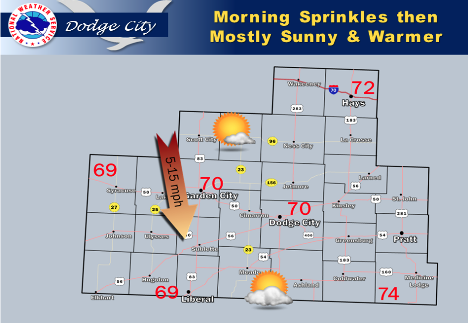 A few sprinkles are possible through 8 am, then clearing skies can be expected. High temperatures will be in the upper 60s to mid 70s.