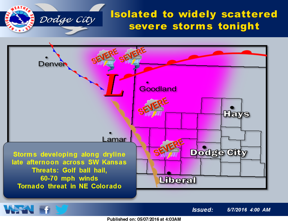 FileLA few severe storms are possible across southwest Kansas tonight with a large hail and wind threat. The tornado threat should remain off to the extreme northwest. Sunday afternoon into Sunday night, most of the area is under a risk of severe storms, mainly across north central Kansas. For those with Mother’s Day plans, be sure to pay attention to the weather and have a plan, just in case severe storms happen to threaten your area.