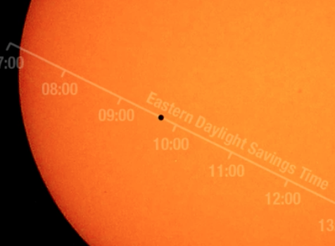Visible just after 7 a.m. on the east coast, the smallest planet will appear as a tiny black dot on the face of the sun, and the transit will last for about 7½ hours. The last time it happened was 2006. It will happen again three years from now, but then not until 2032. NASA says the event occurs only about 13 times a century.