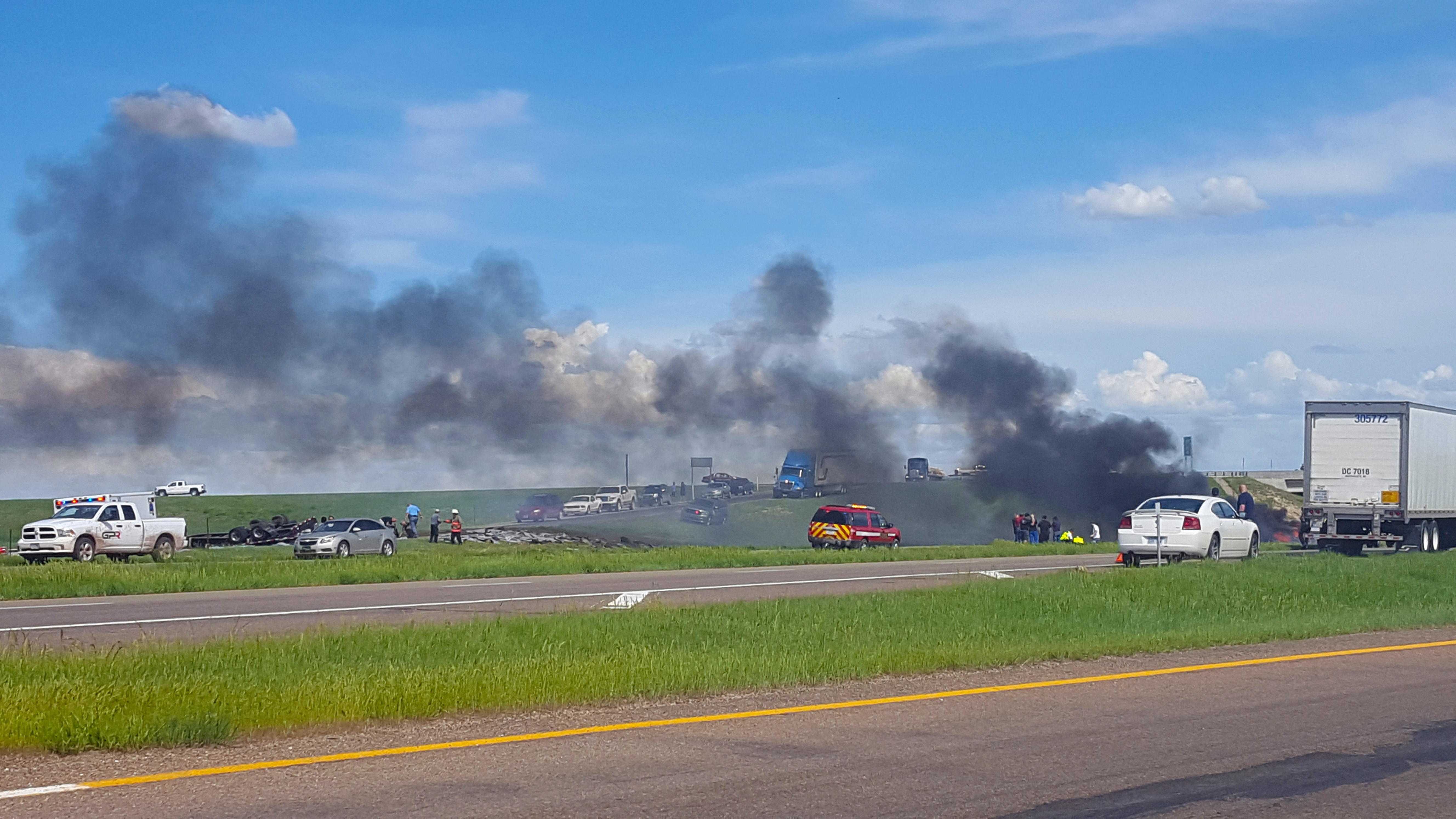 While the cause of the accident is still unknown a semi truck carrying building materials had overturned and came to rest on the north side of the westbound lane. A pickup also involved in the accident came to rest between the east and westbound lanes and caught fire.