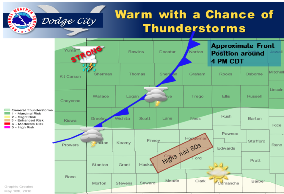 A cold front will move into northwest Kansas this afternoon and continue across western Kansas by midnight. Scattered thunderstorms are expected to develop in northeast Colorado this afternoon and move across northern Kansas tonight. A few thunderstorms may produce hail up to an inch in diameter and wind gusts to near 60 mph. Isolated thunderstorms with gusty winds may form farther south along the front late today but will tend to weaken after sunset.